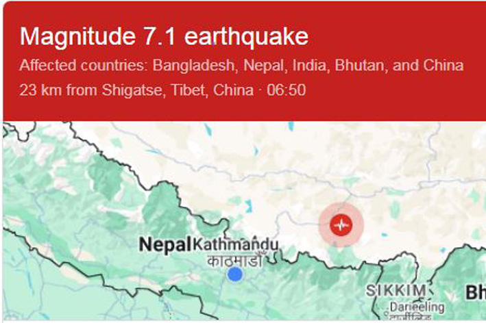 भूकम्पको केन्द्रबिन्दु नेपाल र चीन (तिब्बत)को सीमा क्षेत्र