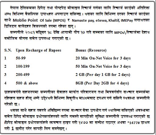 साथै केही सञ्चार माध्यमहरुमा रिचार्ज कार्डको अभावको कारणले नेपाल टेलिकमको राजश्वमा कमी आई व्यापार घाटा भएको भनी भ्रामक समाचारहरु प्रकाशन र प्रसारण भएको पाइएकोमा उक्त समाचारहरुमा कुनै सत्यता नरहेको समेत कम्पनी स्पष्ट पार्दछ । रिचार्ज कार्डको सहज रुपमा आपूर्ति हुन नसकेको अवस्थामा पनि ग्राहकवर्गले रिचार्ज कार्डको विकल्पको रुपमा रहेका ःयदष्भि एयष्लत इा क्बभि ९ःएइक्० र ल्बmबकतभ उबथ, भक्भधब, प्जबतिष्, क्ष्ःभ्एबथ लगायतका डिजिटल वालेटहरु प्रयोग गरी प्रिपेड तथा पोष्टपेड मोबाइल रिचार्ज गरिरहेको हुँदा रिचार्ज कार्डको अभावको कारणले कम्पनीको व्यापार र राजश्वमा कुनै नकारात्मक प्रभाव नपरेको व्यहोरा अनुरोध छ ।